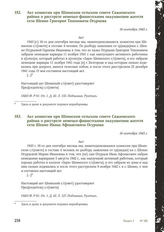 Акт комиссии при Шеинском сельском совете Сажновского района о расстреле немецко-фашистскими оккупантами жителя села Шеино Ивана Афонасовича Огурцова. 16 сентября 1943 г. // ГАБО. Ф. P-61. Оп. 1. Д. 43. Л. 127. Подлинник. Рукопись.