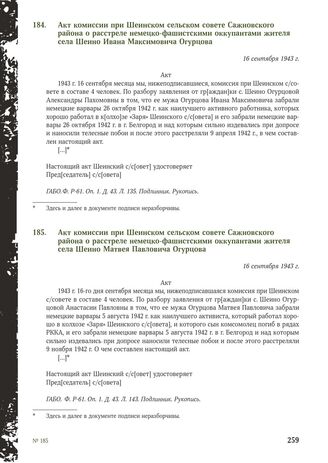 Акт комиссии при Шеинском сельском совете Сажновского района о расстреле немецко-фашистскими оккупантами жителя села Шеино Матвея Павловича Огурцова. 16 сентября 1943 г. // ГАБО. Ф. P-61. Оп. 1. Д. 43. Л. 143. Подлинник. Рукопись.