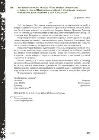 Акт представителей колхоза «Путь вперед» Солдатского сельского совета Шаталовского района о злодеяниях немецких оккупантов, производимых в селе Солдатское. 26 февраля 1943 г. // ГАБО. Ф. P-90. Оп. 1. Д. 3. Л. 111-111 об. Подлинник. Рукопись.