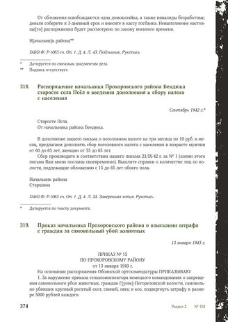 Приказ начальника Прохоровского района о взыскании штрафа с граждан за самовольный убой животных. 13 января 1943 г. // ГАБО. Ф. P-1063. Оп. 1. Д. 4. Л. 14. Типографский экз.