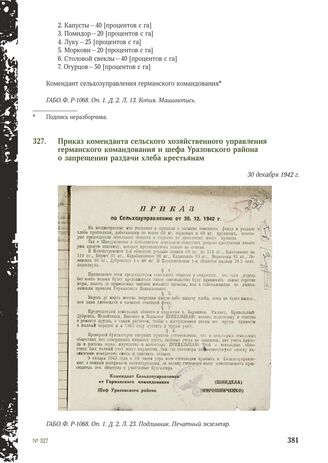 Приказ коменданта сельского хозяйственного управления германского командования и шефа Уразовского района о запрещении раздачи хлеба крестьянам. 30 декабря 1942 г. // ГАБО. Ф. P-1068. Оп. 1. Д. 2. Л. 23. Подлинник. Печатный экземпляр.
