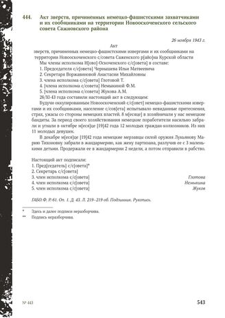 Акт зверств, причиненных немецко-фашистскими захватчиками и их сообщниками на территории Новооскоченского сельского совета Сажновского района. 26 ноября 1943 г. // ГАБО. Ф. Р-61. Оп. 1. Д. 43. Л. 219-219 об. Подлинник. Рукопись.