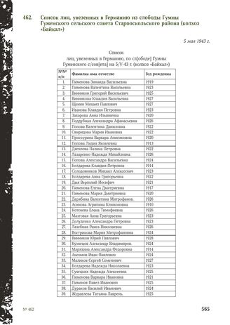 Список лиц, увезенных в Германию из слободы Гумны Гуменского сельск...