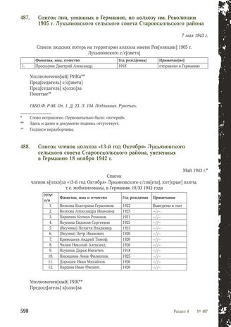 Список членов колхоза «13-й год Октября» Лукьяновского сельского совета Старооскольского района, увезенных в Германию 18 ноября 1942 г. Май 1943 г. // ГАБО. Ф. P-88. Оп. 1. Д. 23. Л. 106. Подлинник. Рукопись.