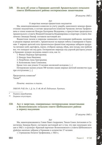 Из акта об угоне в Германию жителей Архангельского сельского совета Шебекинского района гитлеровскими захватчиками. 29 августа 1943 г. // ГАБО. Ф. P-82. Оп. 1. Д. 1а. Л. 46, 46 об. Подлинник. Рукопись.