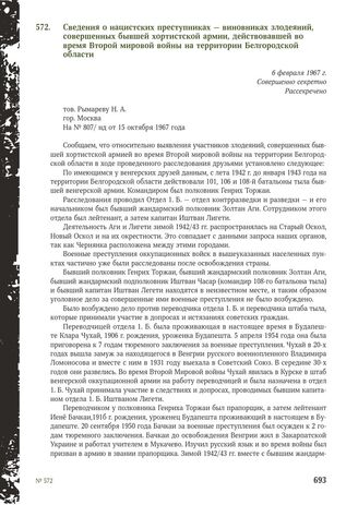 Сведения о нацистских преступниках — виновниках злодеяний, совершенных бывшей хортистской армии, действовавшей во время Второй мировой войны на территории Белгородской области. 6 февраля 1967 г. // АУФСББО. Ф. 10. Гр. 1. Оп. 3. Д. 28. Л. 101-103. Копия. Машинопись.
