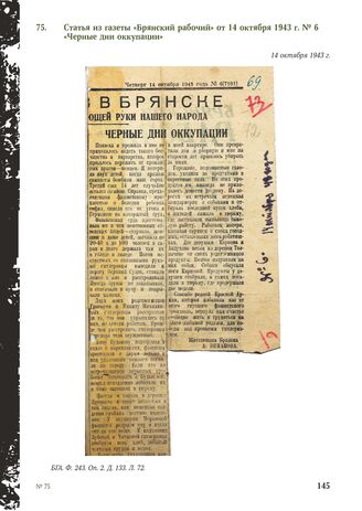 Статья из газеты «Брянский рабочий» от 14 октября 1943 г. № 6 «Черные дни оккупации». 14 октября 1943 г. // БГА. Ф. 243. Oп. 2. Д. 133. Л. 12.