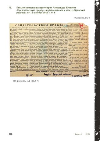 Письмо священника протоиерея Александра Кутепова «Свидетельствую правду», опубликованное в газете «Брянский рабочий» от 14 октября 1943 г. № 6. 14 октября 1943 г.
