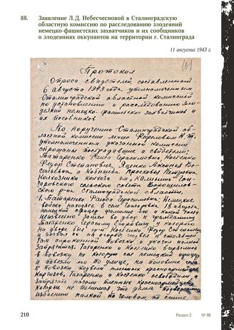 Заявление Л.Д. Небесчесновой в Сталинградскую областную комиссию по расследованию злодеяний немецко-фашистских захватчиков и их сообщников о злодеяниях оккупантов на территории г. Сталинграда. 11 августа 1943 г.