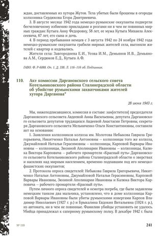 Акт комиссии Даргановского сельского совета Котельниковского района Сталинградской области об убийстве румынскими захватчиками жителей хутора Дарганова. 28 июня 1943 г. // ГАВО. Ф. P-6088. Оп. 1. Д. 533. Л. 10-12 об. Подлинник. Рукопись. Чернила.