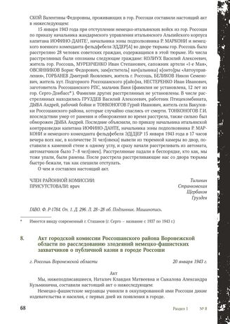 Акт городской комиссии Россошанского района Воронежской области по расследованию злодеяний немецко-фашистских захватчиков о публичной казни в городе Россоши. Г. Россошь Воронежской области, 20 января 1943 г. // ГАОПИ ВО. Ф. 1691. Оп. 1. Д. 31. Л. 15. Подлинник. Машинопись.