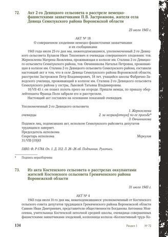 Из акта Костенского сельсовета о расстрелах оккупантами жителей Костенского сельсовета Гремяченского района Воронежской области. 31 июля 1943 г. // ГАВО. Ф. Р-1784. Оп. 1. Д. 152. Л. 8-10 об. Подлинник. Рукопись.