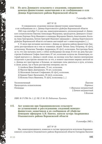 Из акта Девицкого сельсовета о злодеянии, совершенном немецко-фашистскими захватчиками и их сообщниками в селе Девица Коротоякского района Воронежской области. 7 сентября 1943 г. // ГАВО. Ф. Р-1784. Оп. 1. Д. 192. Л. 34-35. Подлинник. Рукопись.