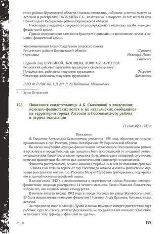 Показания свидетельницы А. К. Сыкаловой о злодеяниях немецко-фашистских войск и их итальянских сообщников на территории города Россоши и Россошанского района в период оккупации. 11 сентября 1943 г. // ГА РФ. Ф. Р-7021. Оп. 22. Д. 494. Л. 213-213 об. Подлинник. Машинопись.