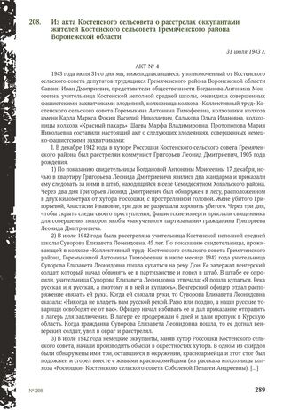 Из акта Костенского сельсовета о расстрелах оккупантами жителей Костенского сельсовета Гремяченского района Воронежской области. 31 июля 1943 г. // ГАВО. Ф. Р-1784. Оп. 1. Д. 152. Л. 8, 9 об., 10 об. Подлинник. Рукопись.