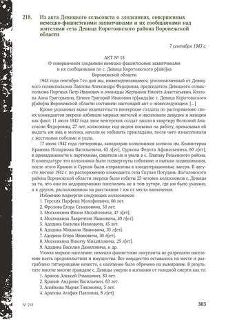 Из акта Девицкого сельсовета о злодеяниях, совершенных немецко-фашистскими захватчиками и их сообщниками над жителями села Девица Коротоякского района Воронежской области. 7 сентября 1943 г.