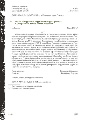 Акт об обнаружении порубленного трупа ребенка в Центральном районе города Воронежа. Март 1943 г., г. Воронеж // ГАВО. Ф. Р-1784. Оп. 1. Д. 38. Л. 3. Машинопись. Копия.