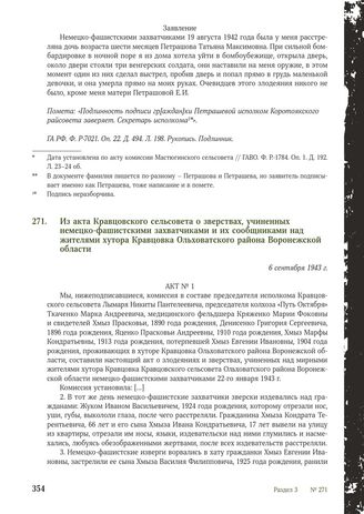 Из акта Кравцовского сельсовета о зверствах, учиненных немецко-фашистскими захватчиками и их сообщниками над жителями хутора Кравцовка Ольховатского района Воронежской области. 6 сентября 1943 г. // ГАВО. Ф. Р-1784. Оп. 1. Д. 257. Л. 1-1 об., 2-2 об. Подлинник. Рукопись.