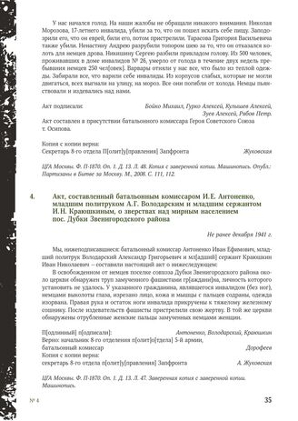 Акт, составленный батальонным комиссаром И.Е. Антоненко, младшим политруком А.Г. Володарским и младшим сержантом И.Н. Краюшкиным, о зверствах над мирным населением пос. Дубки Звенигородского района. Не ранее декабря 1941 г. // ЦГА Москвы. Ф. П-1870. Oп. 1. Д. 13. Л. 47. Заверенная копия с заверенной копии. Машинопись.