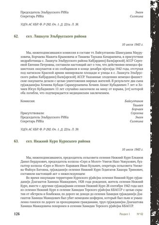 Акт Чрезвычайной государственной комиссии по установлению и расследованию злодеяний немецко-фашистских оккупантов и их сообщников. сел. Нижний Курп Курпского района. 10 июля 1943 г. // УЦГА АС КБР. Ф. P-292. Oп. 1. Д. 40. Л. 9.