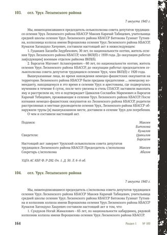 Акт Чрезвычайной государственной комиссии по установлению и расследованию злодеяний немецко-фашистских оккупантов и их сообщников. сел. Урух Лескенского района. 7 августа 1943 г. [2] // УЦГА АС КБР. Ф. P-292. Oп. 1. Д. 50. Л. 7-7 об