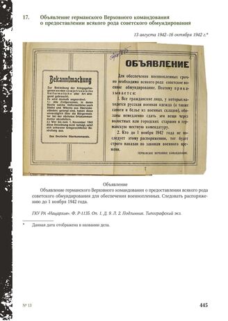 Объявление германского Верховного командования о предоставлении всякого рода советского обмундирования. 13 августа 1942-16 октября 1942 г.