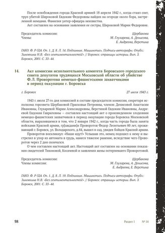 Акт комиссии исполнительного комитета Боровского городского совета депутатов трудящихся Московской области об убийстве Ф.Л. Проворотова немецко-фашистскими захватчиками в период оккупации г. Боровска. Г. Боровск, 27 июля 1943 г. // ГАКО. Ф. P-524. Оп. 1. Д. 8. Л. 19. Подлинник. Машинопись. Подписи-автографы. Опубл.: Зиновкина Н. В. «Без сентиментальностей!» // Боровск: страницы истории. Вып. 3. Боровск, 2001. С. 33-44.