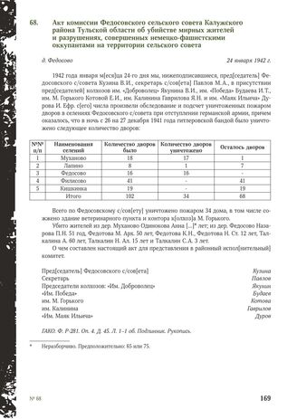 Акт комиссии Федосовского сельского совета Калужского района Тульской области об убийстве мирных жителей и разрушениях, совершенных немецко-фашистскими оккупантами на территории сельского совета. Д. Федосово, 24 января 1942 г.