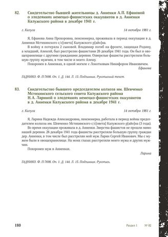 Свидетельство бывшего председателем колхоза им. Шевченко Мстихинского сельского совета Калужского района Н.А. Лариной о злодеяниях немецко-фашистских оккупантов в д. Анненки Калужского района в декабре 1941 г. Г. Калуга, 14 октября 1981 г.