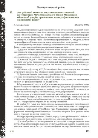 Акт районной комиссии по установлению злодеяний на территории Малоярославецкого района Московской области об ущербе, причиненном немецко-фашистскими оккупантами району. Г. Малоярославец, 24 марта 1944 г. // ГАКО. Ф. P-658. Оп. 1. Д. 93. Л. 3-8. Копия. Машинопись. Подписи-автографы.
