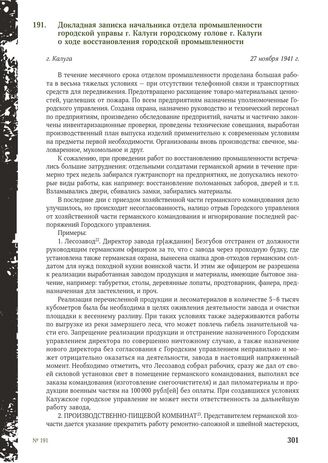 Докладная записка начальника отдела промышленности городской управы г. Калуги городскому голове г. Калуги о ходе восстановления городской промышленности. Г. Калуга, 27 ноября 1941 г. // ГАКО. Ф. P-970. Оп. 1. Д. 52. Л. 3-7. Подлинник. Машинопись. Подпись-автограф.
