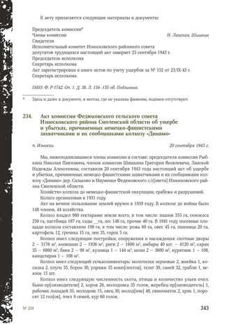 Акт комиссии Федюковского сельского совета Износковского района Смоленской области об ущербе и убытках, причиненных немецко-фашистскими захватчиками и их сообщниками колхозу «Динамо». П. Износки, 20 сентября 1943 г. // ГАКО. Ф. P-1742. Оп. 1. Д. 38. Л. 106-107 об. Подлинник. Рукопись на машинописном бланке.