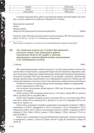 Акт комиссии колхоза им. Сталина Нестеровского сельского совета Спас-Деменского района Смоленской области об ущербе и убытках, причиненных немецко-фашистскими захватчиками и их сообщниками колхозу. Г. Москва, 1949 г. // ГАКО. Ф. P-813. Оп. 3. Д. 7. Л. 359. Л. 360. Копия. Машинопись.