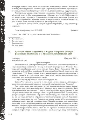Протокол опроса свидетеля Ф.Я. Судина о зверствах немецко-фашистских захватчиков в г. Армавире Краснодарского края. 13 августа 1943 г. // ГАКК. Ф. P-897. Oп. 1. Д. 2. Т. 1. Л. 128-129. Копия. Машинопись. Опубл.: Кровавые страницы немецко-фашистской оккупации на Кубани. Краснодар, 2019. С. 28-32.
