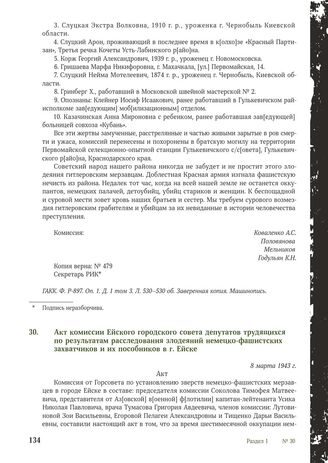 Акт комиссии Ейского городского совета депутатов трудящихся по результатам расследования злодеяний немецко-фашистских захватчиков и их пособников в г. Ейске. 8 марта 1943 г. // ГАКК. Ф. P-897. Oп. 1. Д. 2. Т. 1. Л. 35-35 об. Подлинник. Машинопись. Опубл.: Кровавые страницы немецко-фашистской оккупации на Кубани. Краснодар. 2019. С. 39-41.