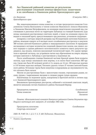 Акт Каневской районной комиссии по результатам расследования злодеяний немецко-фашистских захватчиков и их пособников в Каневском районе Краснодарского края. ст. Каневская Краснодарского края. 12 августа 1943 г. // ГАКК. Ф. P-897. Oп. 1. Д. 2. Т. 2. Л. 420. Подлинник. Машинопись.
