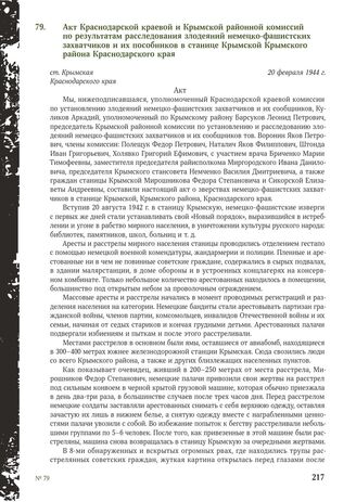 Акт Краснодарской краевой и Крымской районной комиссий по результатам расследования злодеяний немецко-фашистских захватчиков и их пособников в станице Крымской Крымского района Краснодарского края. 20 февраля 1944 г. // ГАКК. Ф. P-897. Oп. 1. Д. 3. Л. 19, 19 об., 20. Подлинник. Машинопись. Опубл.: Кубань, опаленная войной (о жертвах и злодеяниях захватчиков на территории Краснодарского края, временно оккупированной в 1942-1943 гг.). Краснодар, 2005 С. 33-35.