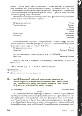 Акт Нефтегорской районной комиссии по результатам расследования злодеяний немецко-фашистских захватчиков и их пособников о казни партизанки в поселке Нефтегорске Нефтегорского района Краснодарского края. пос. Нефтегорск. 20 ноября 1943 г. // ГАКК. Ф. P-897. Oп. 1. Д. 1. Т. 1. Л. 95-95 об. Подлинник. Рукопись.