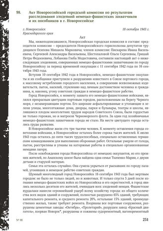 Акт Новороссийской городской комиссии по результатам расследования злодеяний немецко-фашистских захватчиков и их пособников в г. Новороссийске. 18 октября 1943 г. // ГАКК. Ф. P-897. Oп. 1. Д. 1. Т. 2. Л. 217-233. Подлинник. Машинопись.
