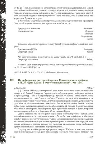 Из информации лекторской группы Краснодарского крайкома ВЛКСМ «Дети Кубани в Отечественной войне» (1941-1945). г. Краснодар. 1945 г. // ЦДНИКК. Ф. 2006. Oп. 2. Д. 311. Л. 1-16. Копия. Машинопись.