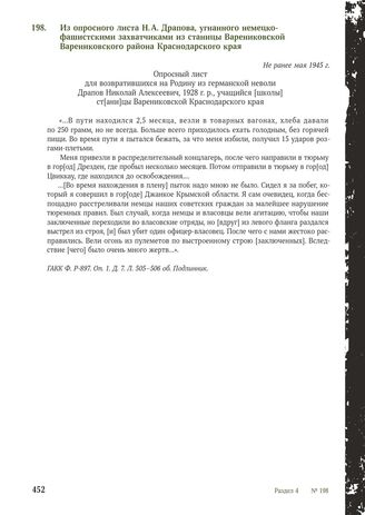 Из опросного листа Н.А. Драпова, угнанного немецко-фашистскими захватчиками из станицы Варениковской Варениковского района Краснодарского края. Не ранее мая 1945 г. // ГАКК. Ф. P-897. Oп. 1. Д. 7. Л. 505-506 об. Подлинник.