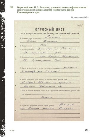 Опросный лист И.Д. Липского, угнанного немецко-фашистскими захватчиками из хутора Адагума Павловского района Краснодарского края. Не ранее мая 1945 г.