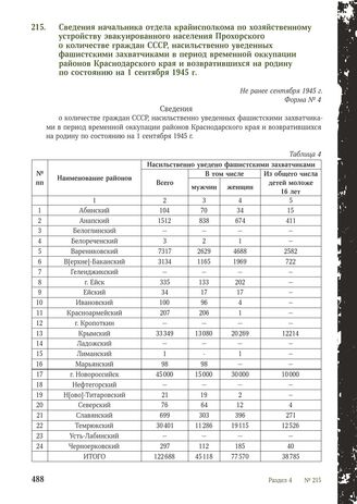 Сведения начальника отдела крайисполкома по хозяйственному устройству эвакуированного населения Прохорского о количестве граждан СССР, насильственно уведенных фашистскими захватчиками в период временной оккупации районов Краснодарского края и возвратившихся на родину по состоянию на 1 августа 1945 г. Не ранее сентября 1945 г. // ЦДНИКК. Ф. 1774-А. Oп. 2. Д. 1936. Л. 3. Подлинник. Рукопись.