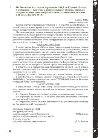Из бюллетеня 4-го отдела Управления НКВД по Курской области о положении и зверствах в районах Курской области, временно оккупированных немецко-фашистскими захватчиками за время с 11 по 25 февраля 1942 г. 5 марта 1942 г.