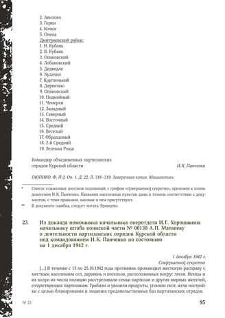 Из доклада помощника начальника оперотдела И. Г. Хорошавина начальнику штаба воинской части № 00130 А.П. Матвееву о деятельности партизанских отрядов Курской области под командованием И. К. Панченко по состоянию на 1 декабря 1942 г. 1 декабря 1942 г. // ГАОПИКО. Ф. П-2. Оп. 1. Д. 22. Л. 31-32. Копия. Машинопись.
