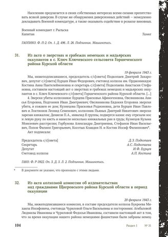 Из акта о зверствах и грабежах немецких и мадьярских оккупантов в с. Ключ Ключевского сельсовета Горшеченского района Курской области. 19 февраля 1943 г. // ГАКО. Ф. P-3922. Оп. 3. Д. 3. Л. 2. Подлинник. Машинопись.