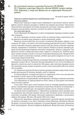 Из докладной записки секретаря Рыльского РК ВКП(б) М.Г. Киреева секретарю Курского обкома ВКП(б) генерал-майору П.И. Доронину о зверствах фашистов на территории Рыльского района. Не ранее 8 марта 1943 г. // ГАКО. Ф. P-3605. Оп. 1. Д. 280. Л. 1-3. Копия. Машинопись.