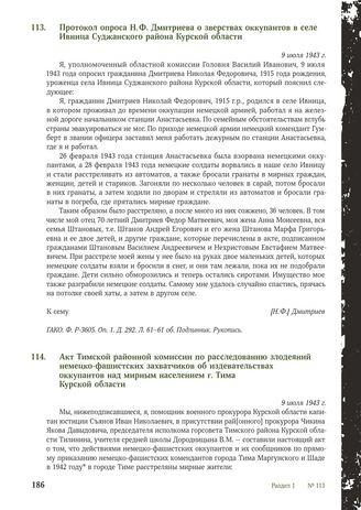 Протокол опроса Н. Ф. Дмитриева о зверствах оккупантов в селе Ивница Суджанского района Курской области