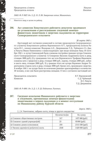 Сведения исполкома Иванинского райсовета о зверствах и злодеяниях, причиненных немецко-фашистскими захватчиками в период оккупации и в момент отступления по Иванинскому району Курской области. Апрель 1943 г. // ГАКО. Ф. P-3925. Оп. 4. Д. 9. Л. 90. Копия. Машинопись.