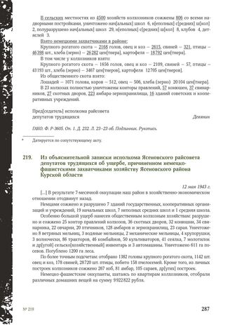 Из объяснительной записки исполкома Ясеновского райсовета депутатов трудящихся об ущербе, причиненном немецко-фашистскими захватчиками хозяйству Ясеновского района Курской области. 12 мая 1943 г. // ГАКО. Ф. P-3605. Оп. 1. Д. 304. Л. 11-11 об. Подлинник. Рукопись.